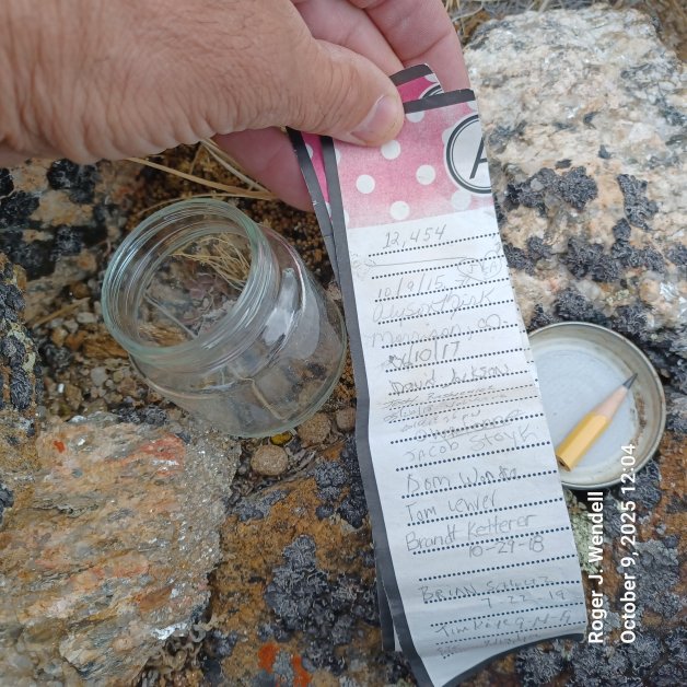 Roger and the RegisterOver the years I've also encountered dozens of "unofficial" summit registers - like this one inside a glass jar atop Unnamed Peak 12,915 feet (Near Mt. Lindsey). I would be curious to know who maintains these and where they're eventually archived - please email me if you have any info on the subject! Unfortunately I've discovered many of these glass jar summit registers either cracked, broken, or the lids so rusty that water leaks through and destroys the paper. So, I often try to air 'em out a bit when I find they're wet and then place them in a well protected portion of rock, on the summit, that's obvious for other hikers to find. Either way, it's always fun to find summit registers, even when they're on peaks as low as 12 thousand feet (3,657 m)!